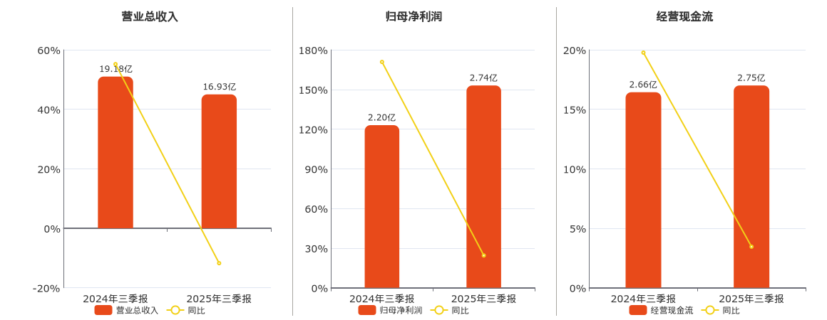 公司营业总收入为16.93亿元,较去年同报告期营业总收入减少2.25亿元,同比较去年同期下降11.75%。归母净利润为2.74亿元。经营活动现金净流入为2.75亿元。
