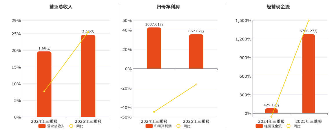 公司营业总收入为2.11亿元,较去年同报告期营业总收入增加4277.99万元,实现4年连续上涨,同比较去年同期上涨25.44%。归母净利润为867.07万元,较去年同报告期归母净利润减少170.54万元,同比较去年同期下降16.44%。经营活动现金净流入为6786.27万元,较去年同报告期经营活动现金净流入增加6361.09万元,同比较去年同期上涨1496.11%。