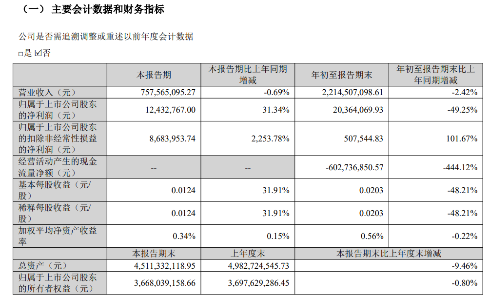 其中第三季度,公司营业收入为7.58亿元,同比下降0.69%;归母净利润为1243万元,同比上升31.34%;扣非归母净利润为868万元,同比上升2253.78%。