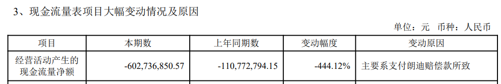 三季报显示,公司三季度末货币资金减少50.38%,主要系支付朗迪赔偿款、偿还贷款、回购股份等所致;公司应收账款增加了68.44%,主要是由于未到期应收账款增加所致;公司经营现金流净额为-6.03亿元,同比下降444.12%,因支付朗迪赔偿款所致。