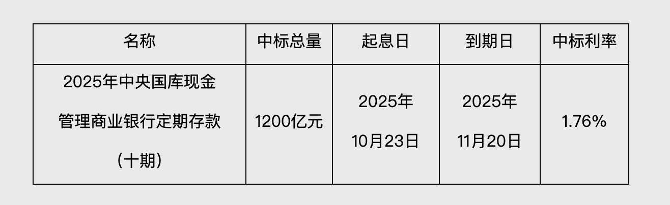 财政部、中国人民银行于2025年10月23日以利率招标方式进行了2025年中央国库现金管理商业银行定期存款(十期)招投标。中标总量1200亿元,中标利率1.76%。