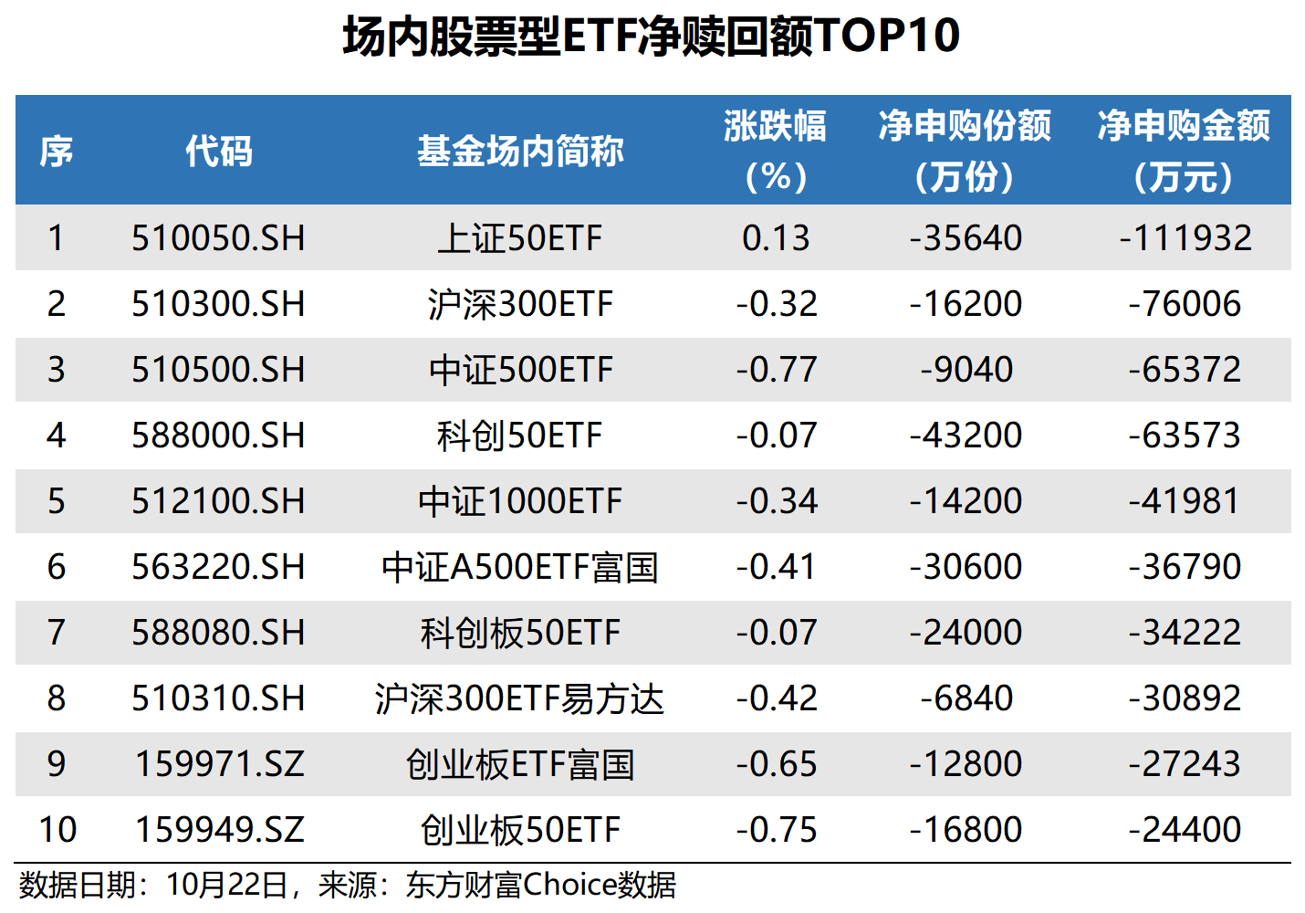 昨日(10月22日),东方财富Choice数据显示,场内股票型ETF净赎回27.12亿份;其中,沪市股票型ETF净赎回15.97亿份,深市股票型ETF净赎回11.15亿份。以最新净值计,昨日市场净赎回63.38亿元。