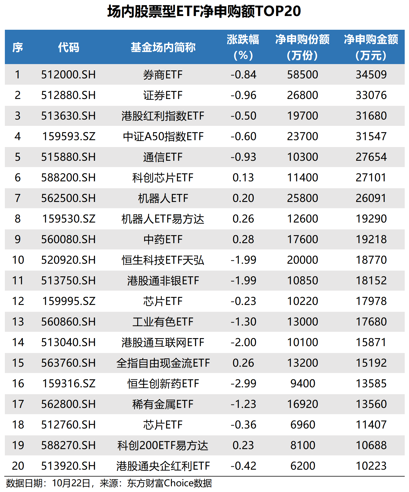 昨日,净申购金额最多的股票型ETF为券商ETF,净申购金额为3.45亿元。此外,证券ETF和港股红利指数ETF也获购居前,净申购金额依次为3.31亿元和3.17亿元。