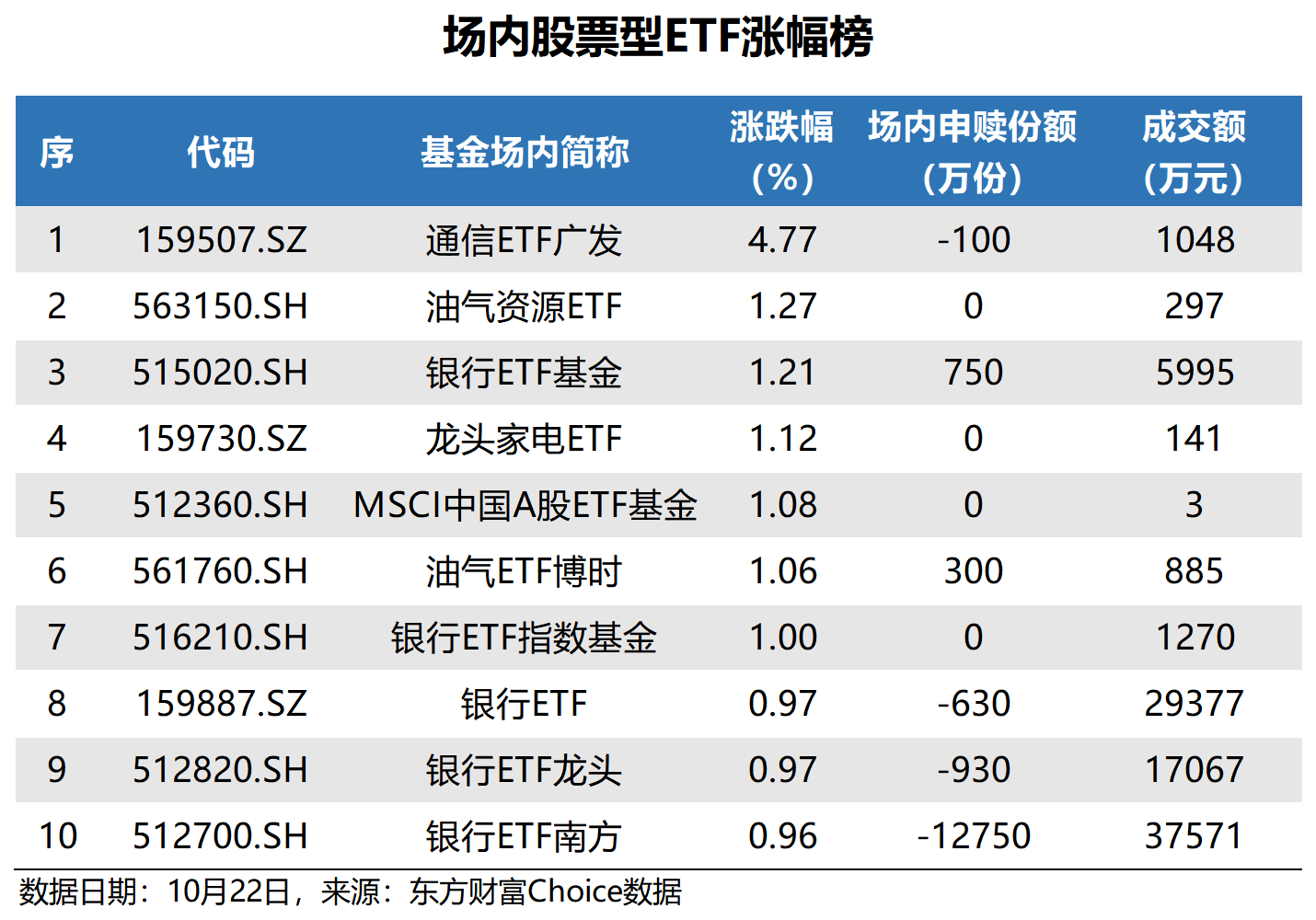 数据显示,昨日场内股票型ETF中,通信ETF广发、油气资源ETF、银行ETF基金涨幅居前。其中,通信ETF广发涨幅最大,为4.77%。
