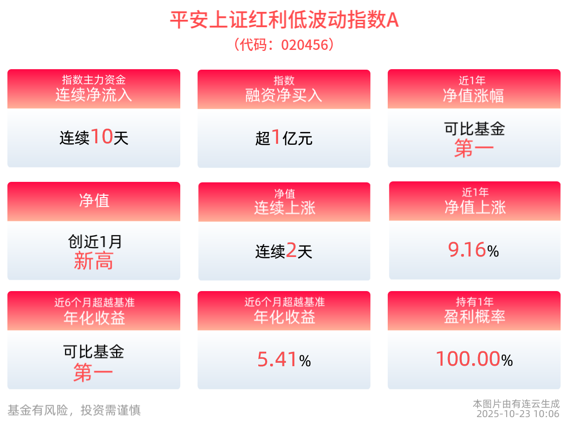 截至2025年10月22日,平安上证红利低波动指数A单位净值为1.11元,较前一交易日上涨0.65%,创近1月新高。