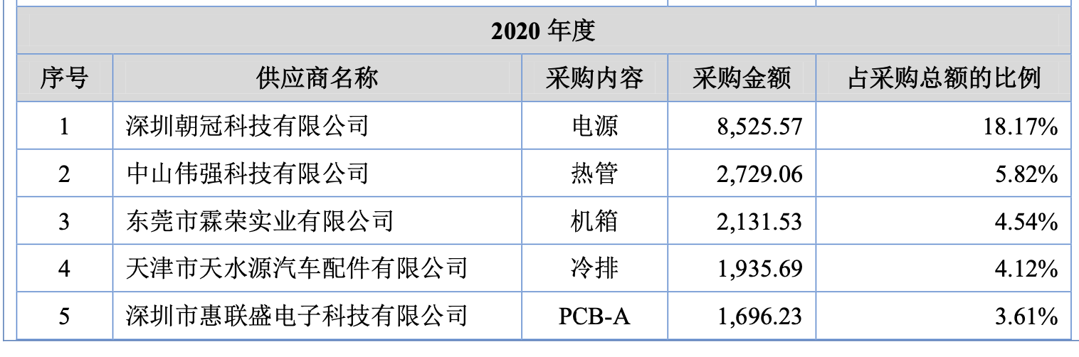 此外,两版招股书披露存在差异的还有2020年关于前五大供应商的采购情况,对比来看,两版招股书披露的前五大供应商的采购金额没有区别,但占采购总额的比例存在小幅出入,原因在于两版招股书披露的采购总额数字不同,在创业板招股书中,公司披露2020年采购金额为4.31亿元(包括1.21亿元成品和3.10亿元原材料),而在北交所招股书中,这一数字为4.69亿元。