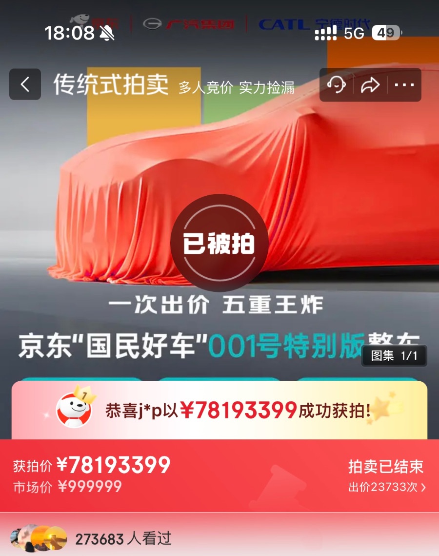 10月22日14时,京东001号“国民好车”在京东拍卖频道正式开拍,吸引了近30万人围观。最终,经过4小时23000多次的竞价,最终一次出价超7800万。10月14日,京东宣布联合广汽集团、宁德时代推出一款新车。