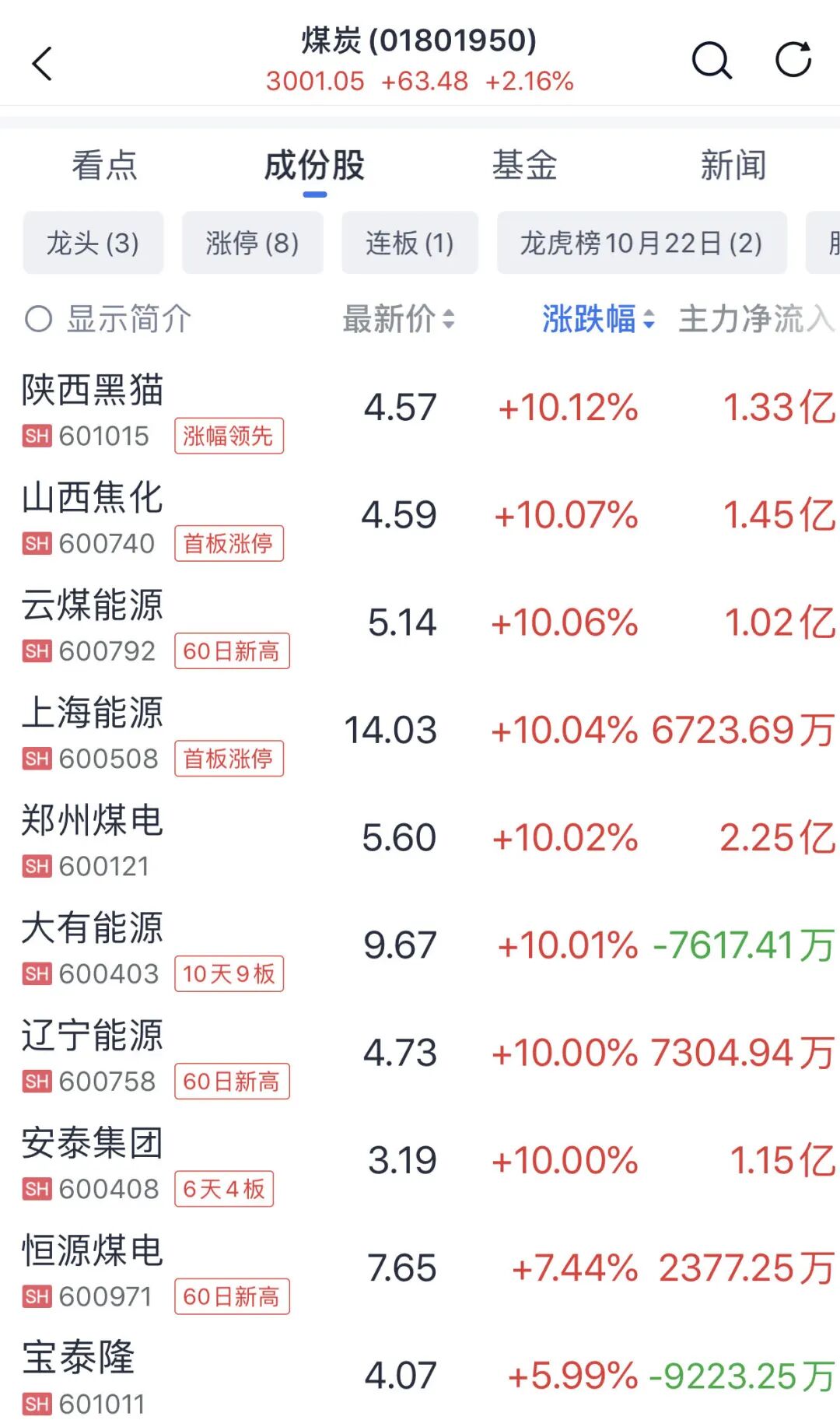 另外,随着近期全国性降温及煤炭价格上行,煤炭板块股票持续走强,大有能源、陕西黑猫、云煤能源、上海能源、郑州煤电等多股涨停。