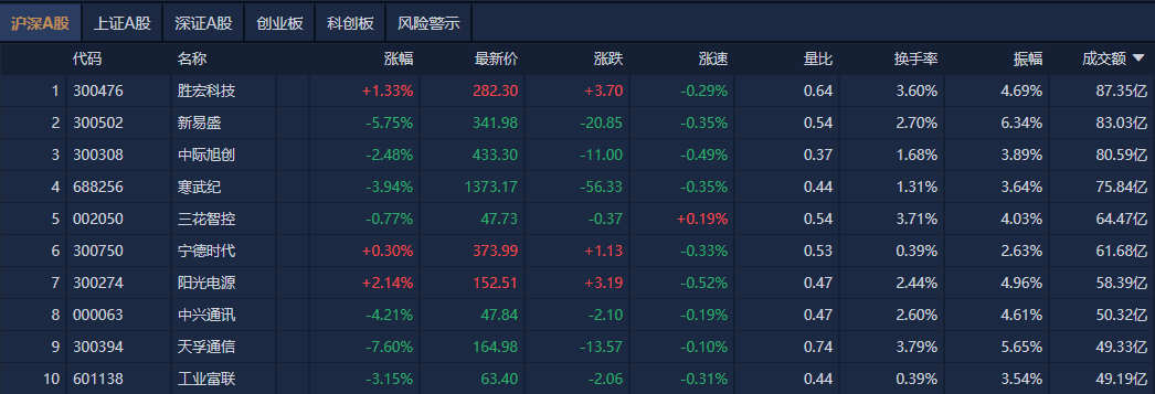 个股方面,胜宏科技成交额超87亿元居首,新易盛、中际旭创、寒武纪成交额靠前。