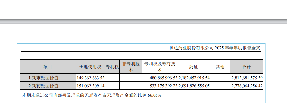 财报显示,截至2025年中期末,贝达药业无形资产和开发支出分别为28.13亿元、2.01亿元,两项合计30.14亿元,占总资产的比例高达32.76%。其中,无形资产中金额最大的两项分别为药证、专利权及专有技术,期末账面价值分别为20.92亿元、5.33亿元。