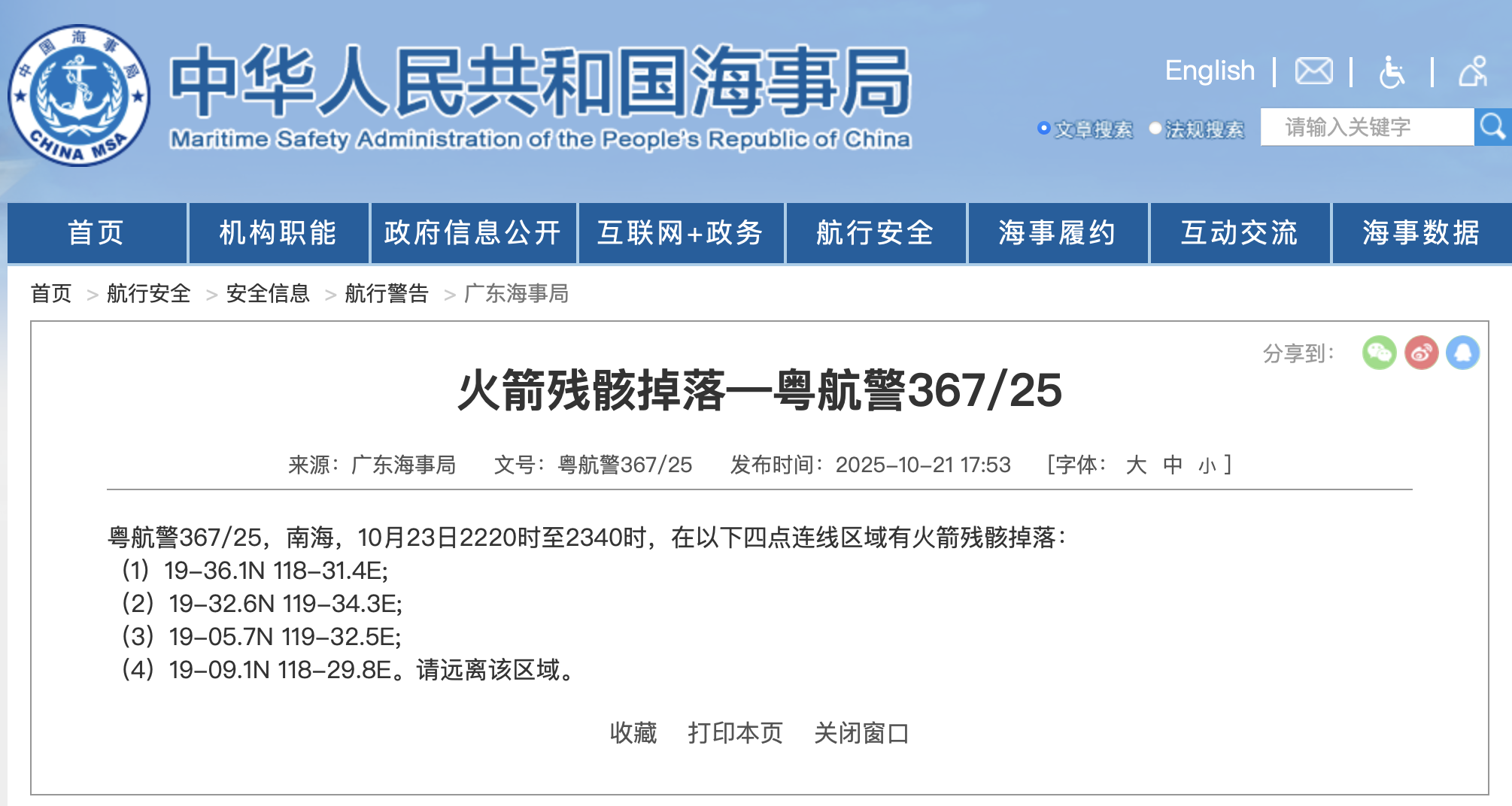 据中国海事局网站消息,广东海事局发布航行警告,10月23日22时20分至23时40分,南海部分水域有火箭残骸掉落,请远离该区域。