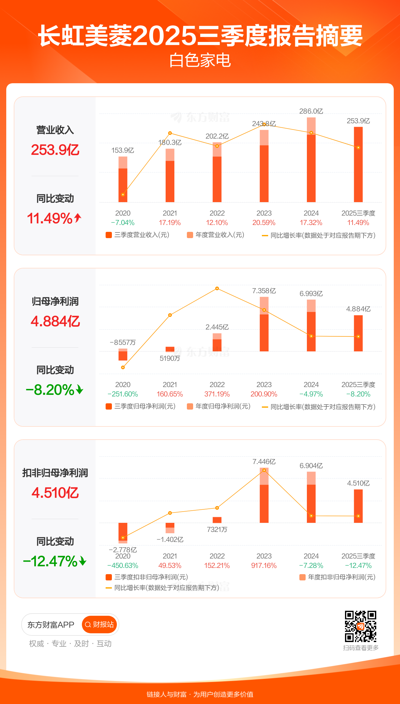 长虹美菱10月23日发布2025年三季报显示,公司前三季实现营业收入253.93亿元,同比增长11.49%;归母净利润4.88亿元,同比下滑8.20%;扣非归母净利润4.51亿元,同比下滑12.47%。每股EPS0.47元,低于机构一致预测的0.73元。