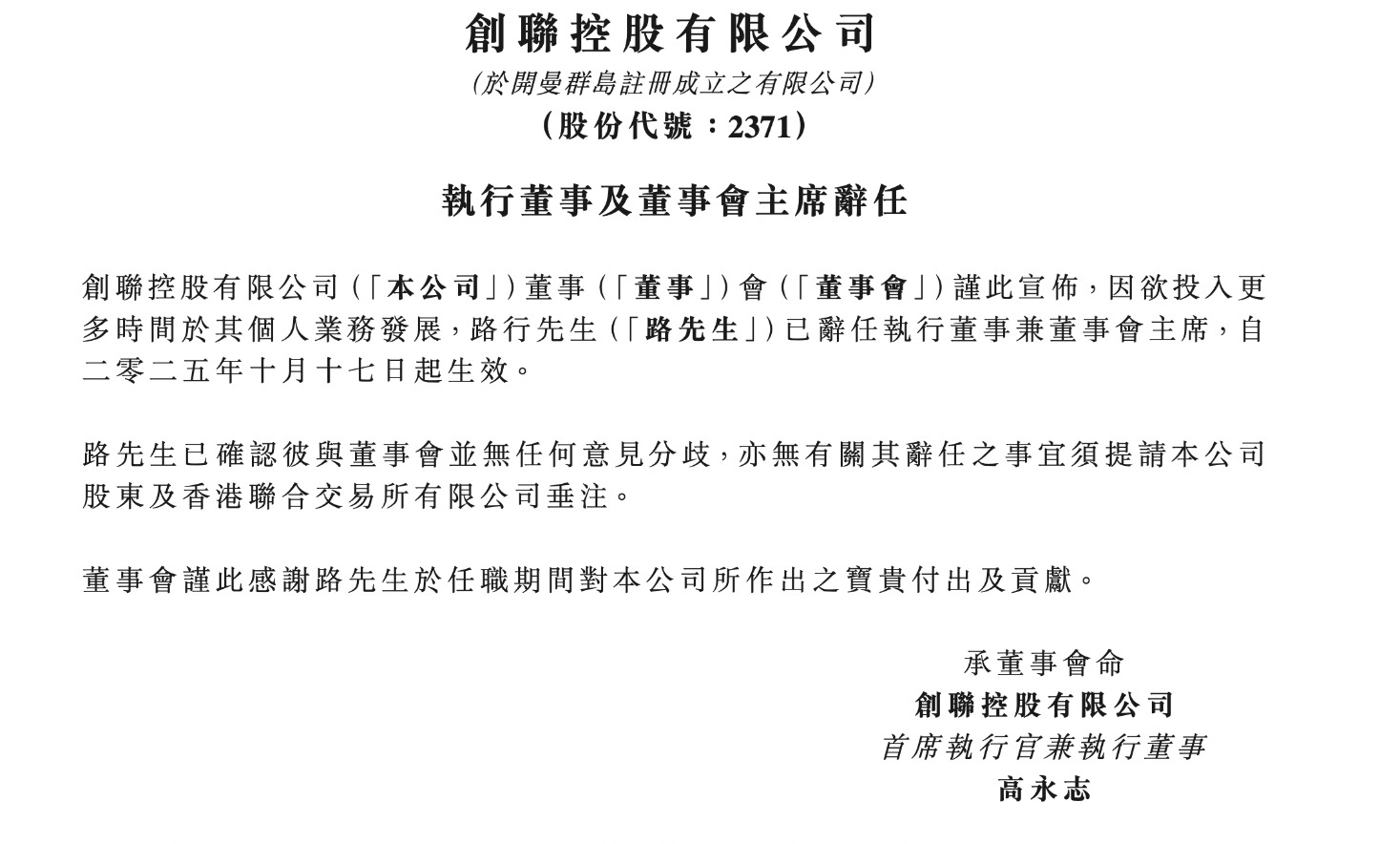 10月17日,创联控股(02371.HK)发布公告称,路行因欲投入更多时间于其个人业务发展,已辞任创联控股有限公司执行董事兼董事会主席,辞任自2025年10月17日起生效。