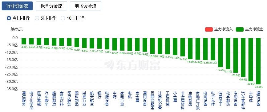 净流出方面,通信设备、半导体、汽车零部件等净流出排名靠前,其中通信设备净流出31.60亿元。