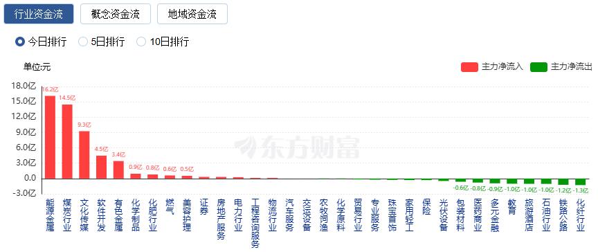 行业资金方面,截至收盘,能源金属、煤炭行业、文化传媒等净流入排名靠前,其中能源金属净流入16.17亿。