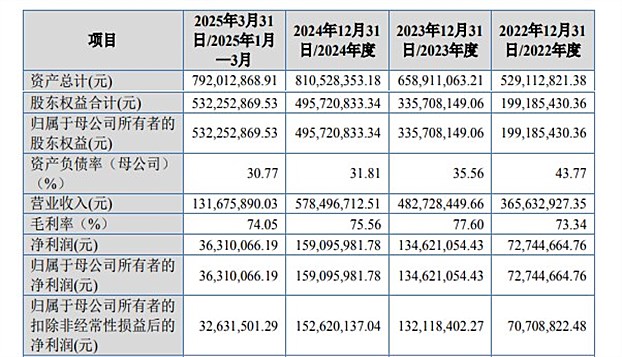 2022年至2024年及2025年一季度(下称“报告期”),公司营业收入分别为3.66亿元、4.83亿元、5.78亿元和1.32亿元,年复合增长率达25.78%;归母净利润分别为7274.47万元、1.35亿元、1.59亿元和3631.01万元。