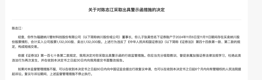 不仅是前妻操纵股票,福建证监局在2024年12月31日发布公告,陈志江因其子张昊恺名下证券账户在2024年11月6日至11月11日期间进行短线交易,被采取出具警示函的监管措施。具体来说,张昊恺在此期间合计买入和卖出纳川股份股票各113万股,违反了《证券法》第四十四条的相关规定。