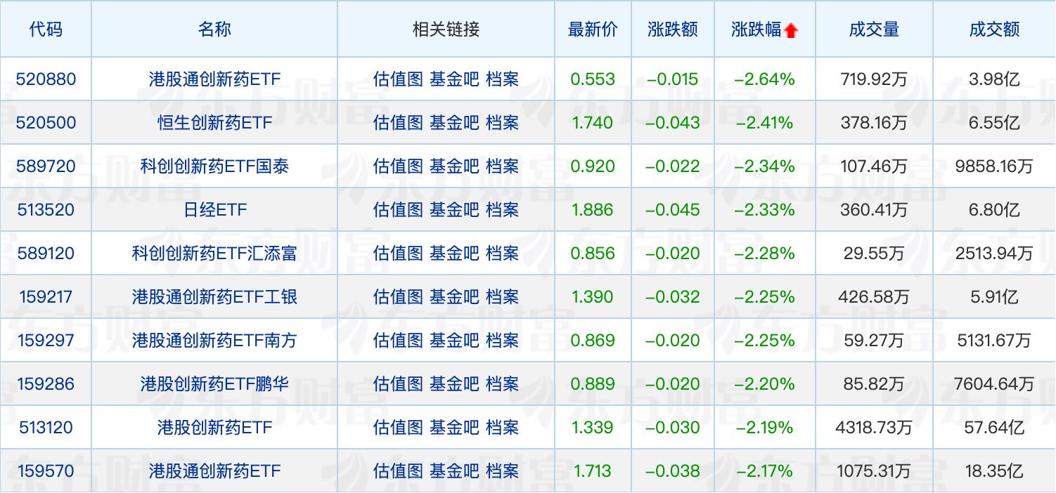 下跌方面,港股创新药相关ETF集体回调,最高下跌2.64%。