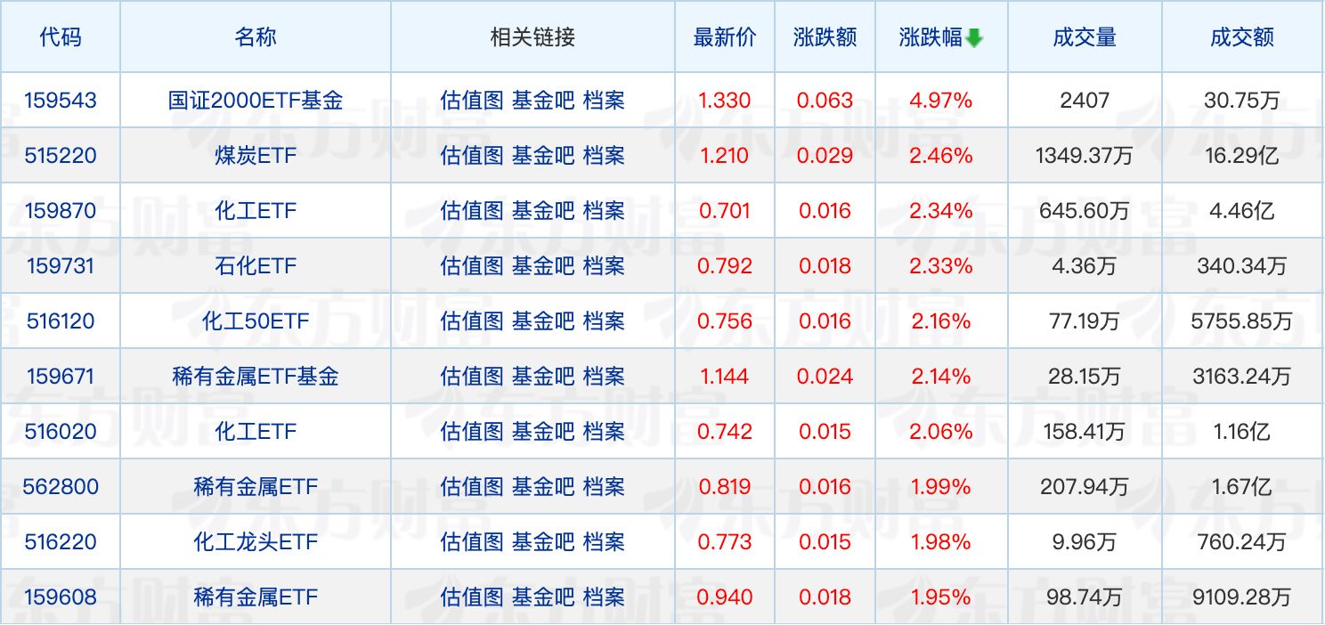 具体来看,国证2000ETF基金领涨4.97%,煤炭ETF、化工相关ETF也有所表现。