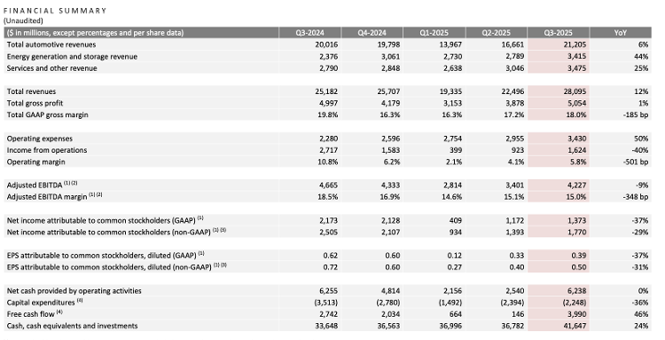 特斯拉Q3汽车业务营收同比增长6%至212亿美元,主要得益于创纪录的汽车销量。据财联社报道,由于美国联邦电动车购车税收抵免于9月30日到期,消费者抢购潮推动交付量攀升。但毛利率(不含监管积分收入)降至15.4%,低于市场预期的15.6%。