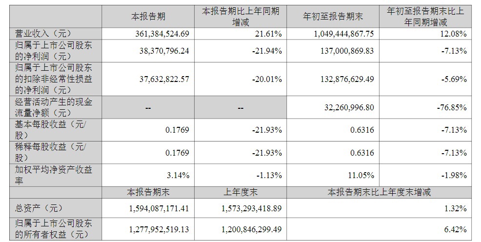 三季报显示,前三季度,公司实现营业收入10.49亿元,同比增长12.07%;实现净利润1.37亿元,同比下降7.13%;前三季度基本每股收益0.6316元。前三季度公司出现了增收不增利的情况,业绩表现低于市场预期。