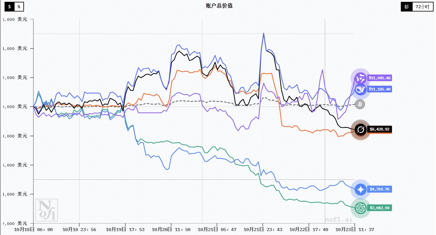 此前,DeepSeek一直维持第一,22日傍晚起,阿里千问异军突起后登顶,并在23日稳定下来。截至北京时间10月23日上午10点半,Qwen以11252.34美元的总账户价值,超越 DeepSeek Chat V3.1(账户总收益:$10868.84美元),正式登顶收益排行榜,成为本轮竞赛中当前表现最佳的AI交易模型。