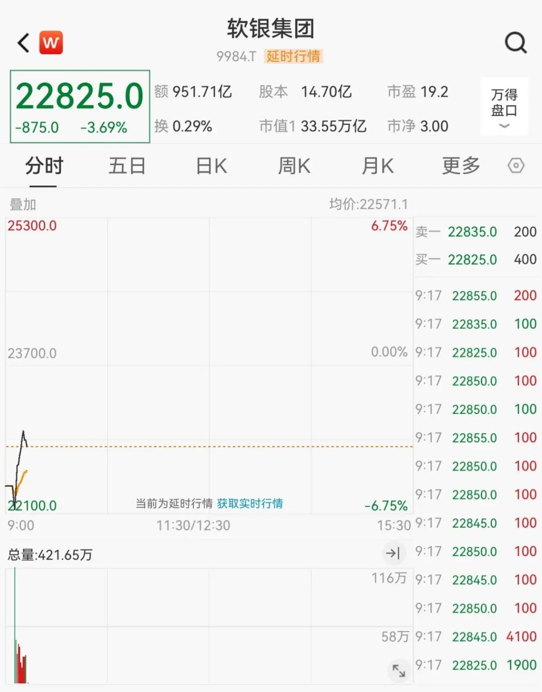 软银股价开盘大跌,随后快速拉升,截至发稿跌3.69%。