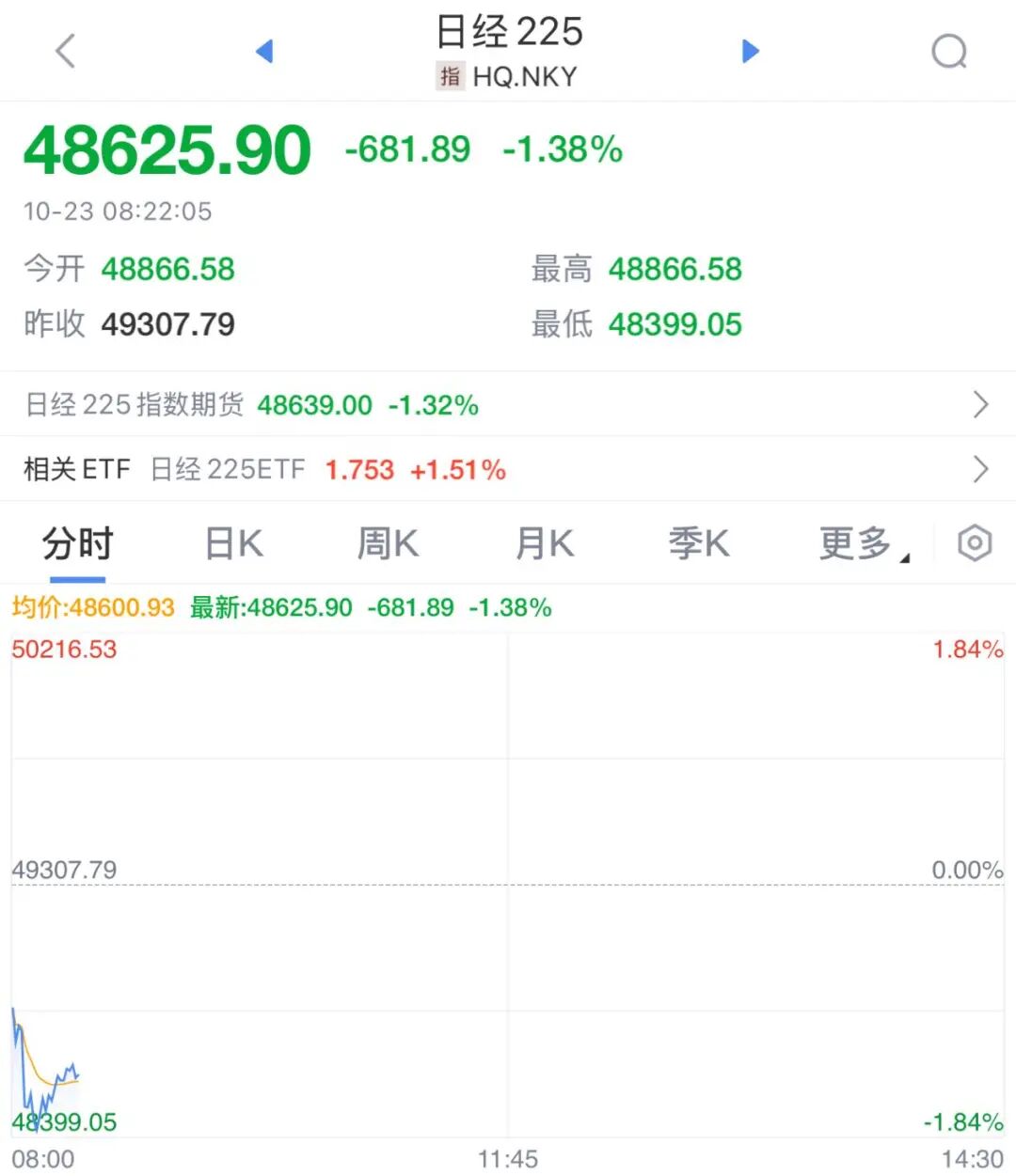 10月23日,日韩股市开盘走低,日经225指数一度跌超1.8%,现报48625.9点。