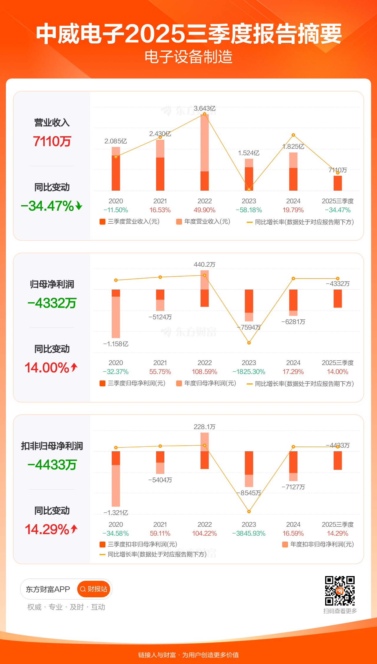 中威电子10月24日发布2025年三季报显示,公司前三季实现营业收入7110.15万元,同比下滑34.47%;归母净利润-4331.78万元;扣非归母净利润-4433.49万元。每股EPS-0.14元,高于机构一致预测的null元。