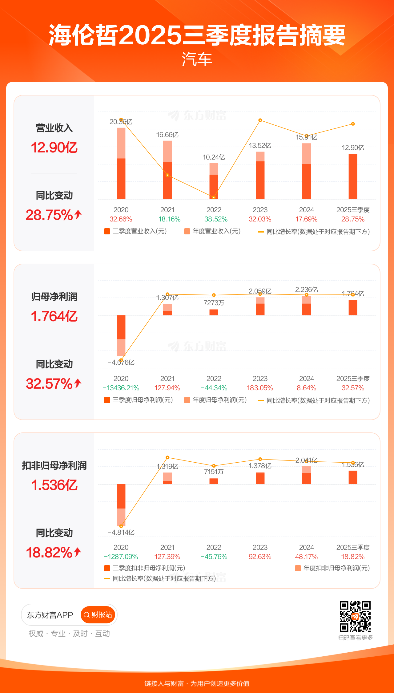 海伦哲10月24日发布2025年三季报显示,公司前三季实现营业收入12.90亿元,同比增长28.75%;归母净利润1.76亿元,同比增长32.57%;扣非归母净利润1.54亿元,同比增长18.82%。每股EPS0.19元,低于机构一致预测的0.30元。