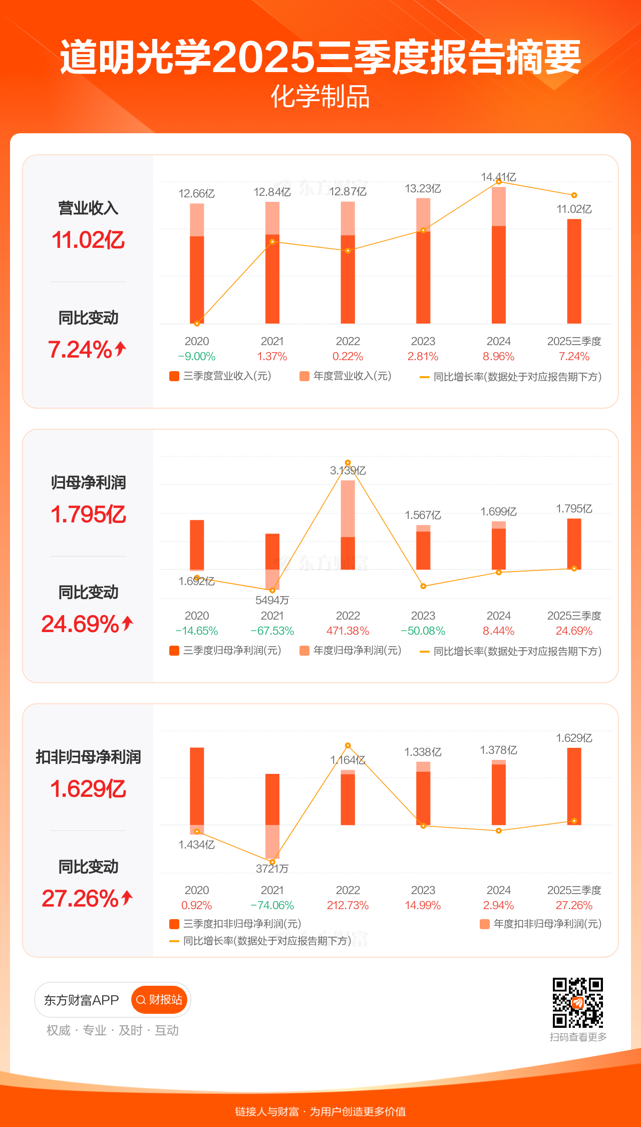 道明光学10月24日发布2025年三季报显示,公司前三季实现营业收入11.02亿元,同比增长7.24%;归母净利润1.80亿元,同比增长24.69%;扣非归母净利润1.63亿元,同比增长27.26%。每股EPS0.29元,低于机构一致预测的0.36元。