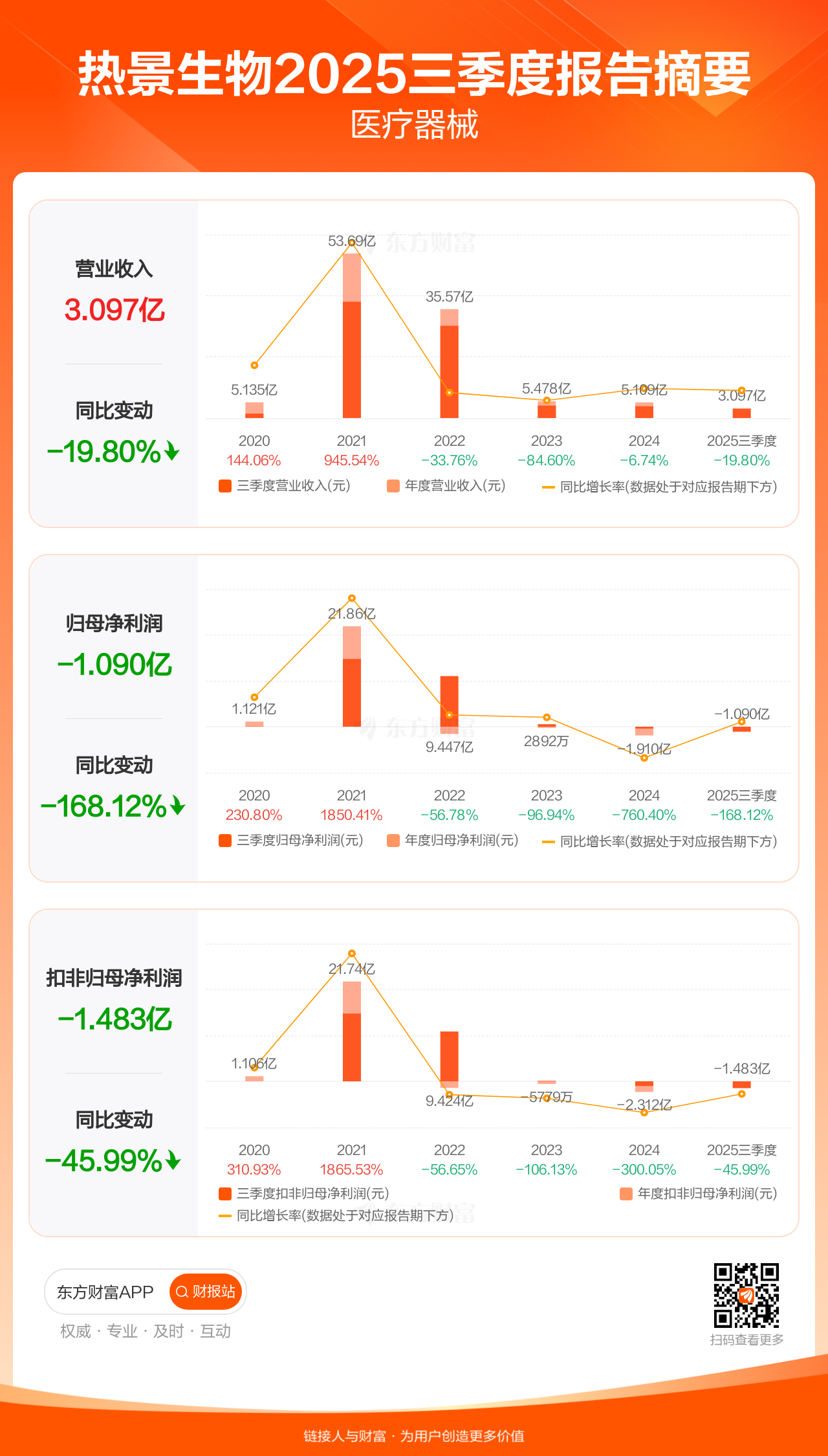 热景生物10月24日发布2025年三季报显示,公司前三季实现营业收入3.10亿元,同比下滑19.80%;归母净利润-1.09亿元;扣非归母净利润-1.48亿元。每股EPS-1.23元,低于机构一致预测的-0.95元。