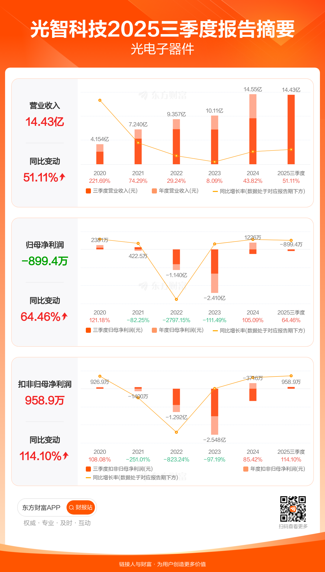 光智科技10月24日发布2025年三季报显示,公司前三季实现营业收入14.43亿元,同比增长51.11%;归母净利润-899.40万元;扣非归母净利润958.95万元,同比增长114.10%。每股EPS-0.07元,高于机构一致预测的null元。