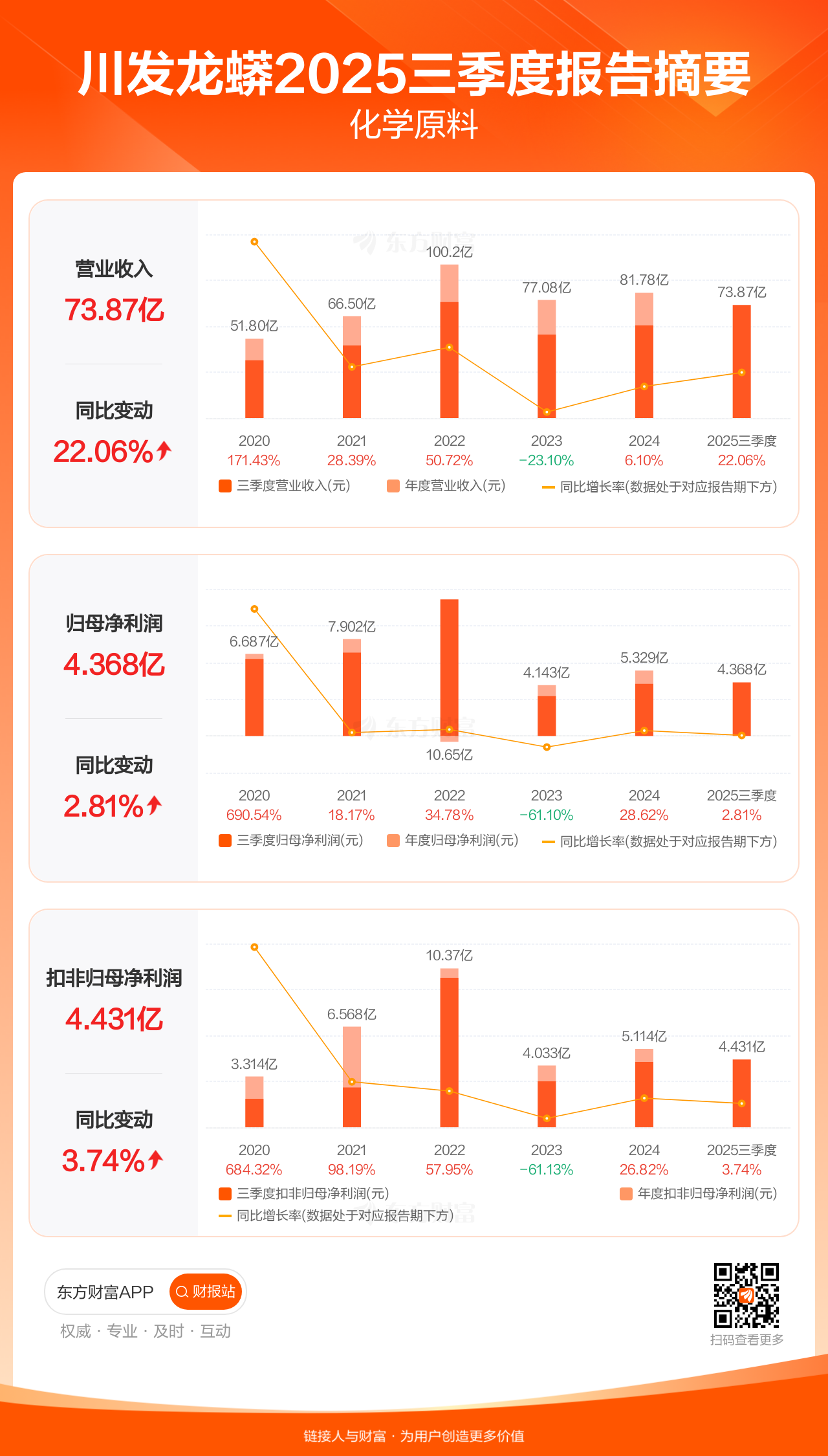 川发龙蟒10月24日发布2025年三季报显示,公司前三季实现营业收入73.87亿元,同比增长22.06%;归母净利润4.37亿元,同比增长2.81%;扣非归母净利润4.43亿元,同比增长3.74%。每股EPS0.23元,低于机构一致预测的0.35元。