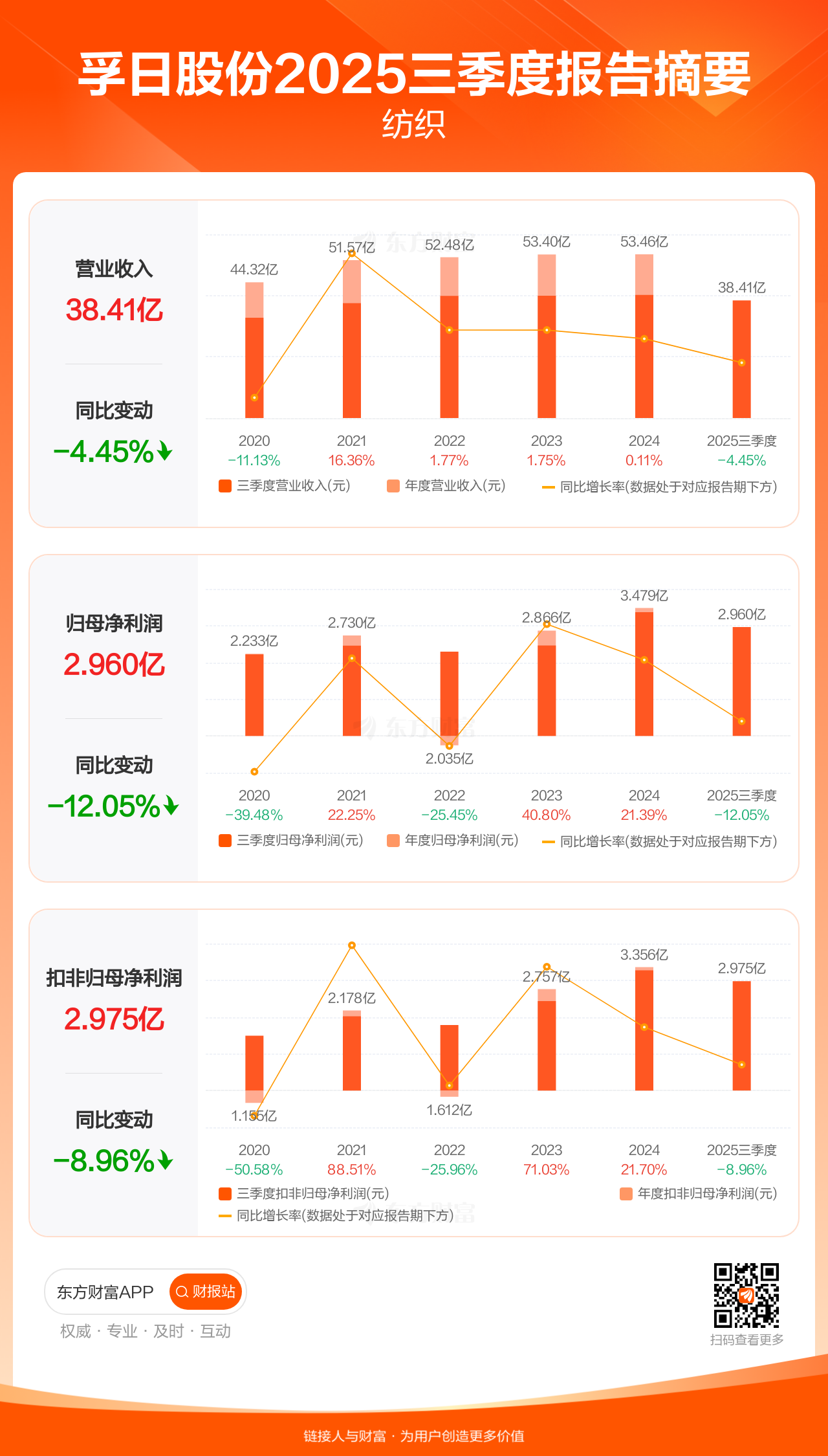 孚日股份10月24日发布2025年三季报显示,公司前三季实现营业收入38.41亿元,同比下滑4.45%;归母净利润2.96亿元,同比下滑12.05%;扣非归母净利润2.98亿元,同比下滑8.96%。每股EPS0.31元,高于机构一致预测的null元。