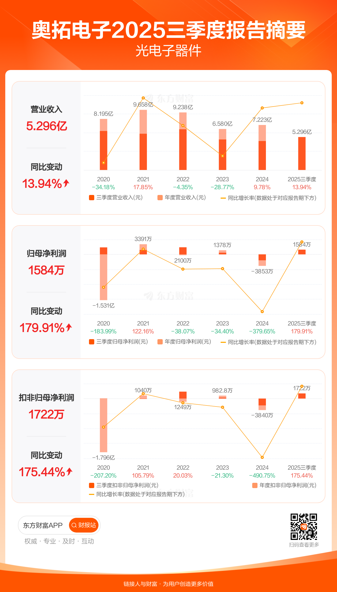 奥拓电子10月24日发布2025年三季报显示,公司前三季实现营业收入5.30亿元,同比增长13.94%;归母净利润1583.95万元,同比增长179.91%;扣非归母净利润1722.21万元,同比增长175.44%。每股EPS0.02元,低于机构一致预测的0.09元。