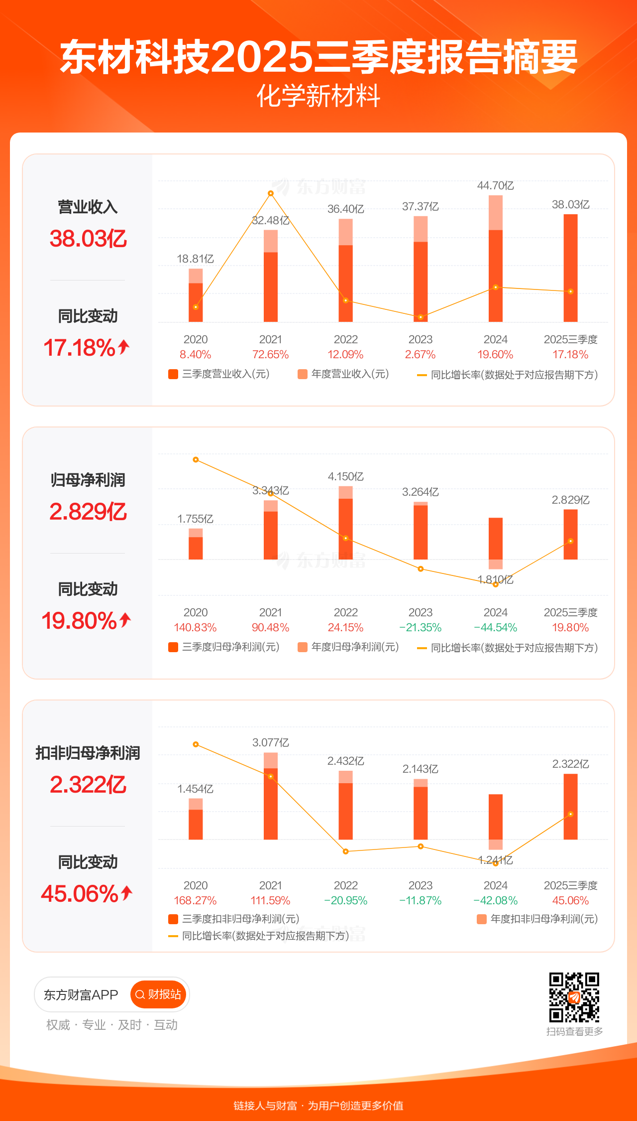 东材科技10月24日发布2025年三季报显示,公司前三季实现营业收入38.03亿元,同比增长17.18%;归母净利润2.83亿元,同比增长19.80%;扣非归母净利润2.32亿元,同比增长45.06%。每股EPS0.31元,低于机构一致预测的0.43元。