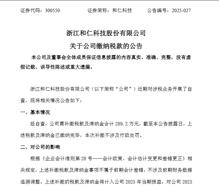 10月23日,浙江和仁科技股份有限公司(以下简称“公司”)近期对涉税业务开展了自查,现将相关情况公告如下:经自查,公司需补缴税款及滞纳金合计 289.2 万元,截至本公告披露日,上述税款及滞纳金已缴纳完毕,本次补缴不涉及行政处罚。