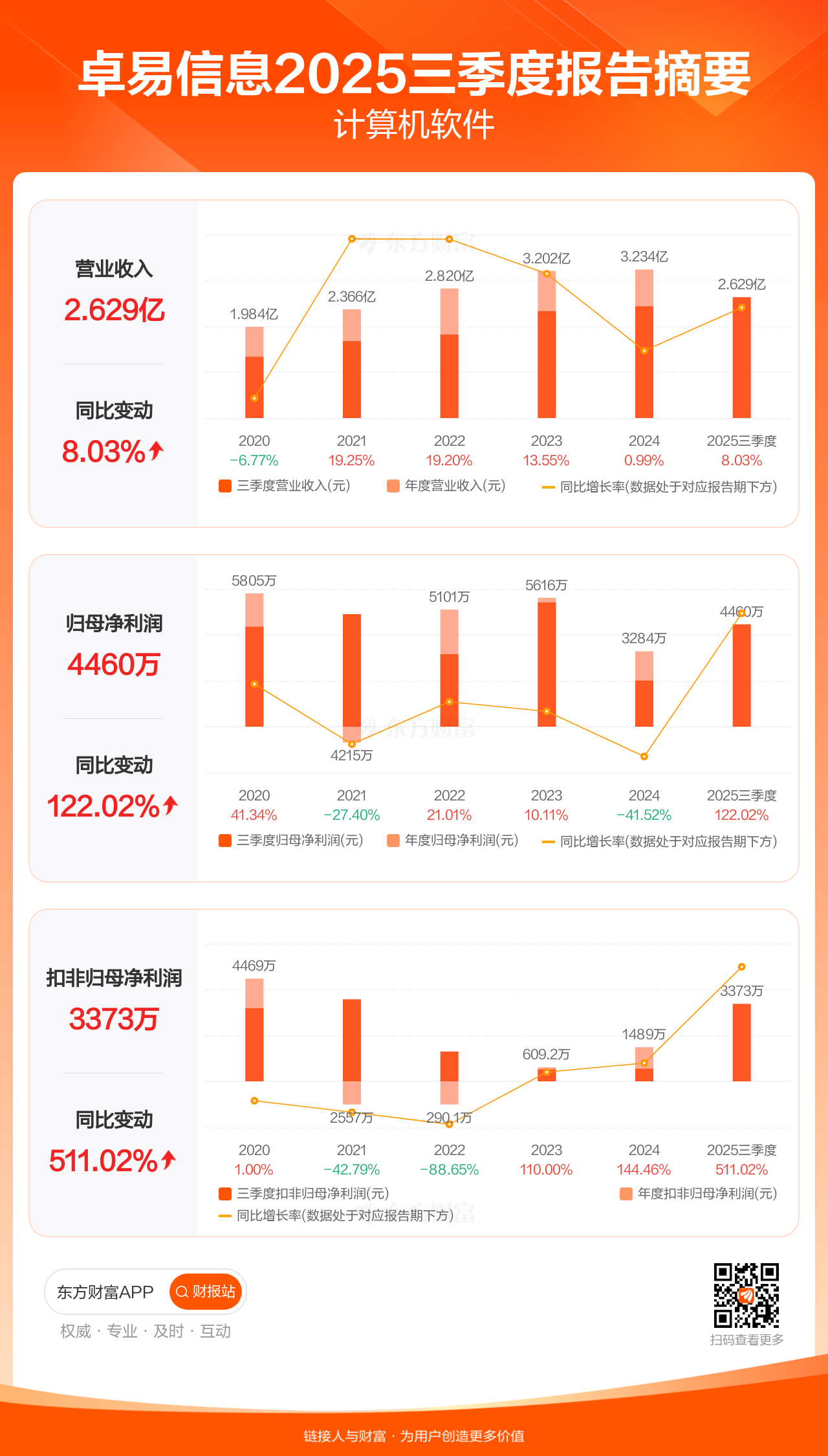 卓易信息10月24日发布2025年三季报显示,公司前三季实现营业收入2.63亿元,同比增长8.03%;归母净利润4460.07万元,同比增长122.02%;扣非归母净利润3373.37万元,同比增长511.02%。每股EPS0.37元,低于机构一致预测的0.70元。