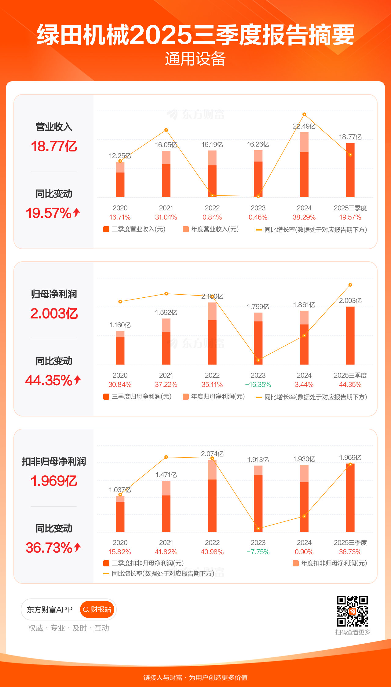 绿田机械10月24日发布2025年三季报显示,公司前三季实现营业收入18.77亿元,同比增长19.57%;归母净利润2.00亿元,同比增长44.35%;扣非归母净利润1.97亿元,同比增长36.73%。每股EPS1.16元,低于机构一致预测的1.54元。