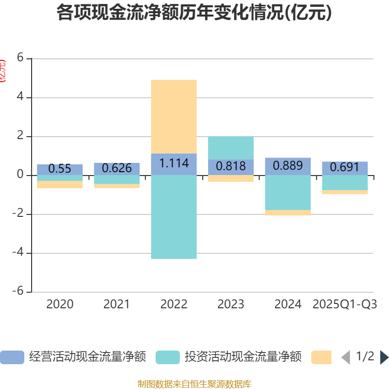 2025年前三季度,公司经营活动现金流净额为6907.63万元,同比下降6.47%;筹资活动现金流净额-2057.1万元,同比增加681.02万元;投资活动现金流净额-7748.47万元,上年同期为-1.5亿元。