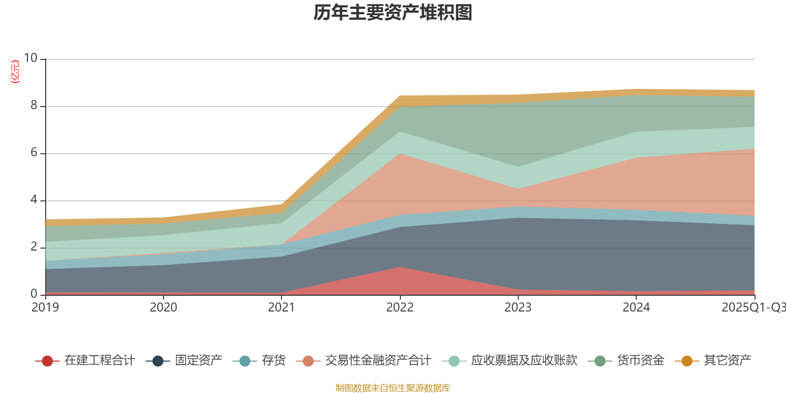 资产重大变化方面,截至2025年三季度末,公司交易性金融资产合计较上年末增加29.13%,占公司总资产比重上升7.58个百分点;货币资金较上年末减少17.51%,占公司总资产比重下降3.04个百分点;固定资产较上年末减少8.03%,占公司总资产比重下降2.58个百分点;应收票据及应收账款较上年末减少16.54%,占公司总资产比重下降2.01个百分点。