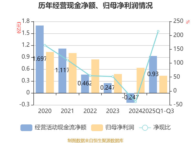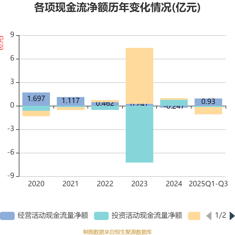 2025年前三季度,公司经营活动现金流净额为9303.99万元,同比增加1.34亿元;筹资活动现金流净额-9275.96万元,同比减少4192.94万元;投资活动现金流净额-1657.13万元,上年同期为975.85万元。