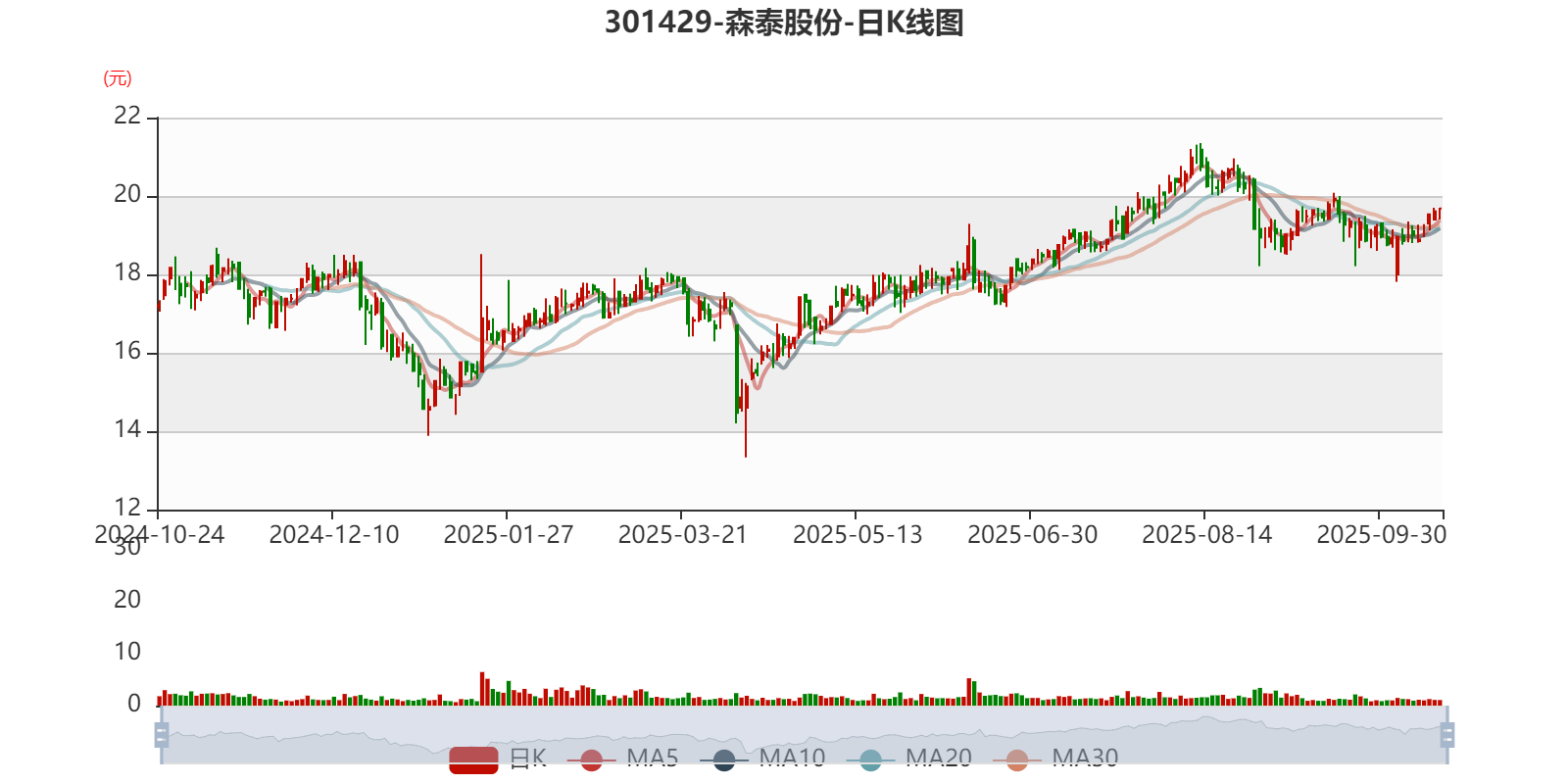 中证智能财讯森泰股份(301429)10月24日披露2025年第三季度报告。前三季度公司实现营业总收入7.33亿元,同比增长14.80%;归母净利润4333.96万元,同比下降20.98%;扣非净利润3510.93万元,同比下降16.97%;经营活动产生的现金流量净额为9303.99万元,上年同期为-4124.39万元;报告期内,森泰股份基本每股收益为0.3749元,加权平均净资产收益率为3.22%。