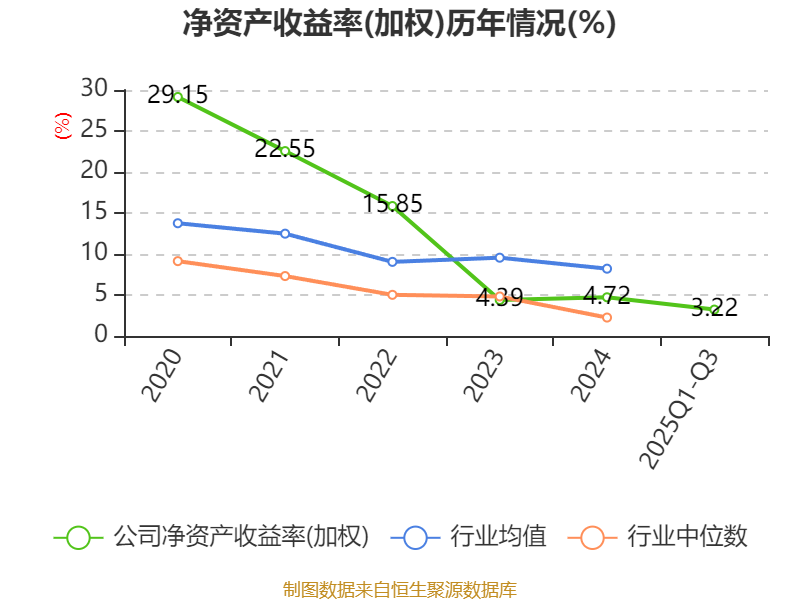 盈利能力方面, 2025年前三季度公司加权平均净资产收益率为3.22%,同比下降0.85个百分点。公司2025年前三季度投入资本回报率为1.63%,较上年同期下降1.22个百分点。