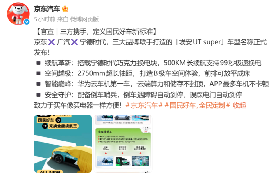 另外,10月23日,京东联合宁德时代、广汽集团推出的“国民好车”车型名称官宣,新车命名为“埃安UT super”。