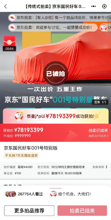 10月22日晚间,京东“国民好车”001号在京东拍卖平台进行拍卖,超过26万人参与了竞拍。竞拍价最终定格为7819万元,而该车的起拍价仅为1元。