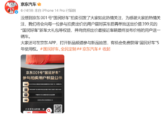 10月23日,京东汽车官方微博发布消息称,没想到京东001号“国民好车”拍卖引发了大家如此热情关注,为感谢关注,将会向每一位参与拍卖出价的用户届时买车后再单独送出价值399元的“国民好车”新车大礼包等权益,并向竞拍出价最接近车辆最终发布价格的用户送一辆车。