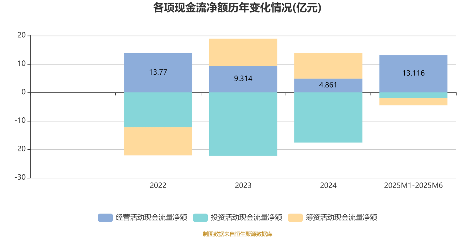 2025年1月至6月,公司经营活动现金流净额为13.12亿元,同比增长473.32%;筹资活动现金流净额-2.48亿元,同比减少9.52亿元;投资活动现金流净额-2.05亿元,上年同期为-8.5亿元。