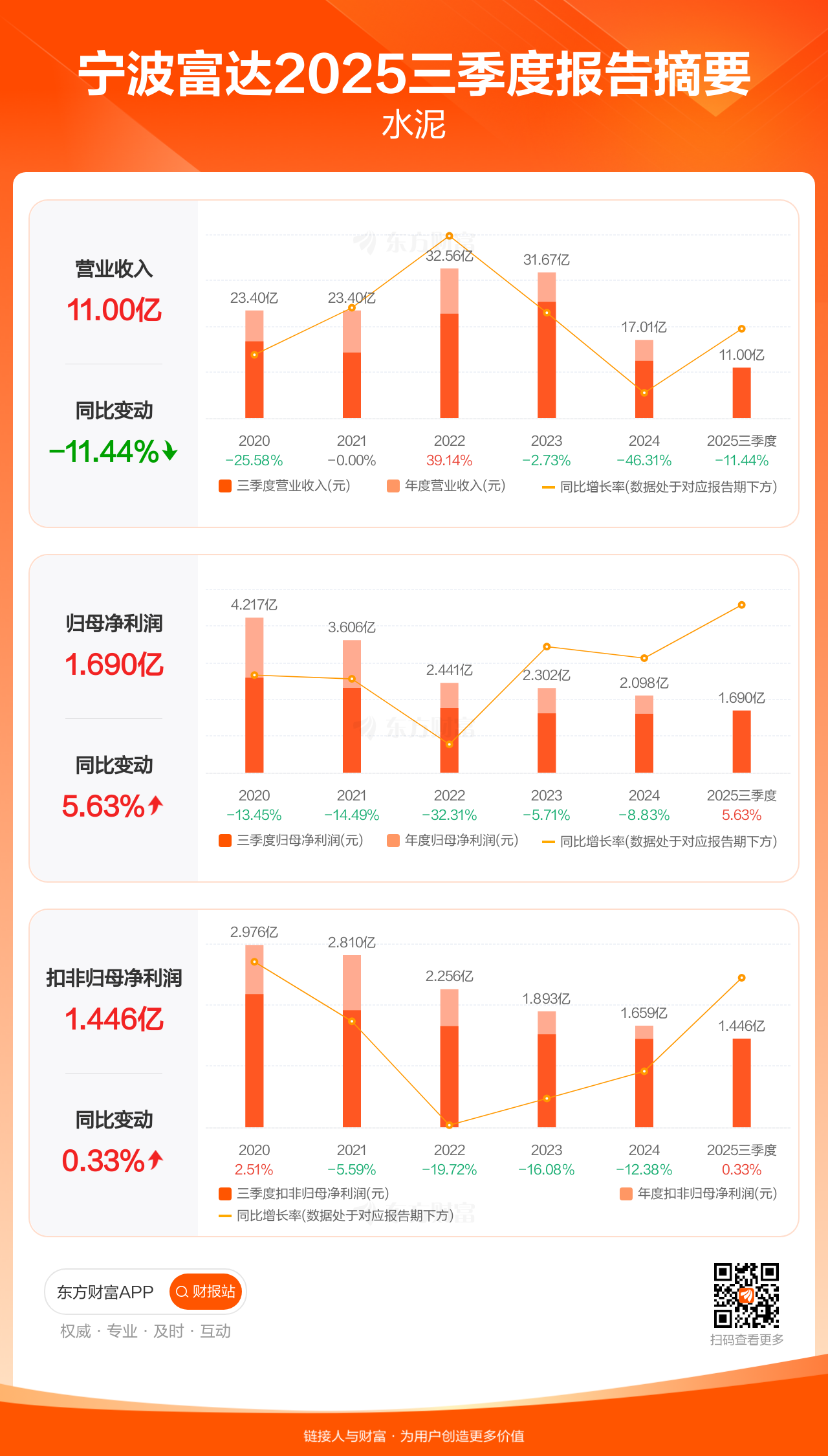宁波富达10月24日发布2025年三季报显示,公司前三季实现营业收入11.00亿元,同比下滑11.44%;归母净利润1.69亿元,同比增长5.63%;扣非归母净利润1.45亿元,同比增长0.33%。每股EPS0.12元,高于机构一致预测的null元。